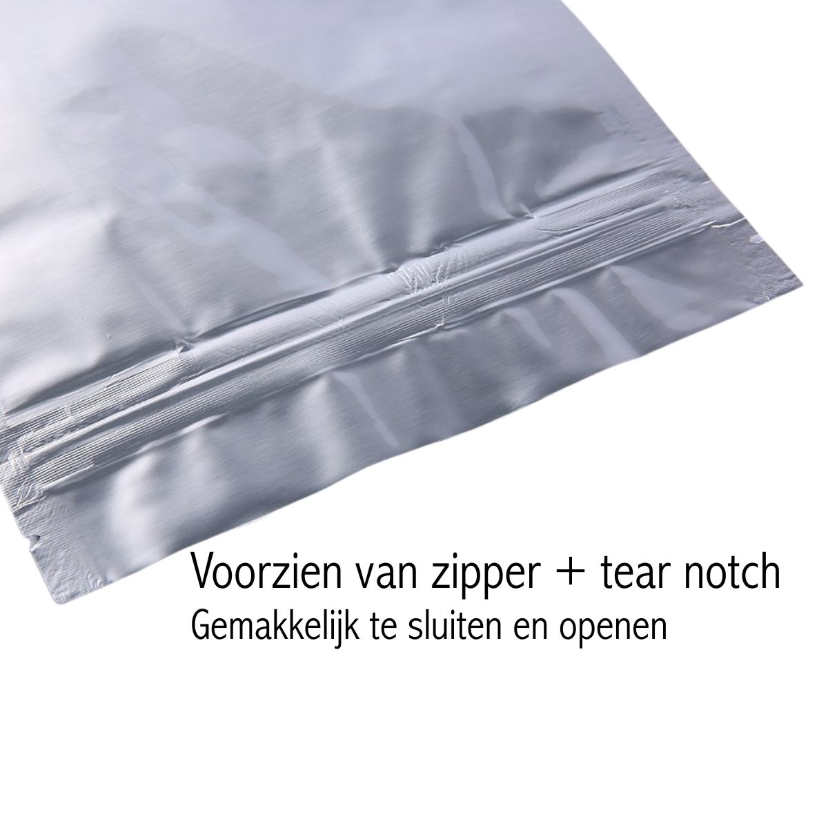 Deze stazakken zijn vervaardigd uit een drielaags laminaat (PET/ALU/PE), waarbij de aluminium laag fungeert als een ondoordringbaar schild tegen uv-licht, vocht en zuurstof. Dit maakt de zakken bij uitstek geschikt voor producten die gevoelig zijn voor bederf of aroma-verlies. De geïntegreerde zipper zorgt voor een gebruiksvriendelijke, hersluitbare verpakking, terwijl de tearnotches aan beide zijden een snelle en nette opening garanderen.