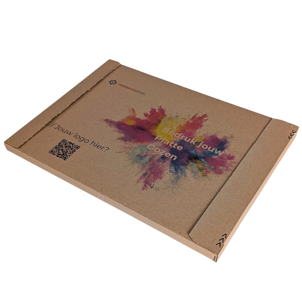 Verstuur je producten in een professionele verpakking die direct opvalt. Dit product wordt geleverd als één complete eenheid van 100 dozen. Met een formaat van 350 x 250 mm en een hoogte van 30 mm is deze doos uitermate geschikt voor het verzenden van dikkere catalogi, kledingaccessoires of elektronica in je eigen huisstijl.