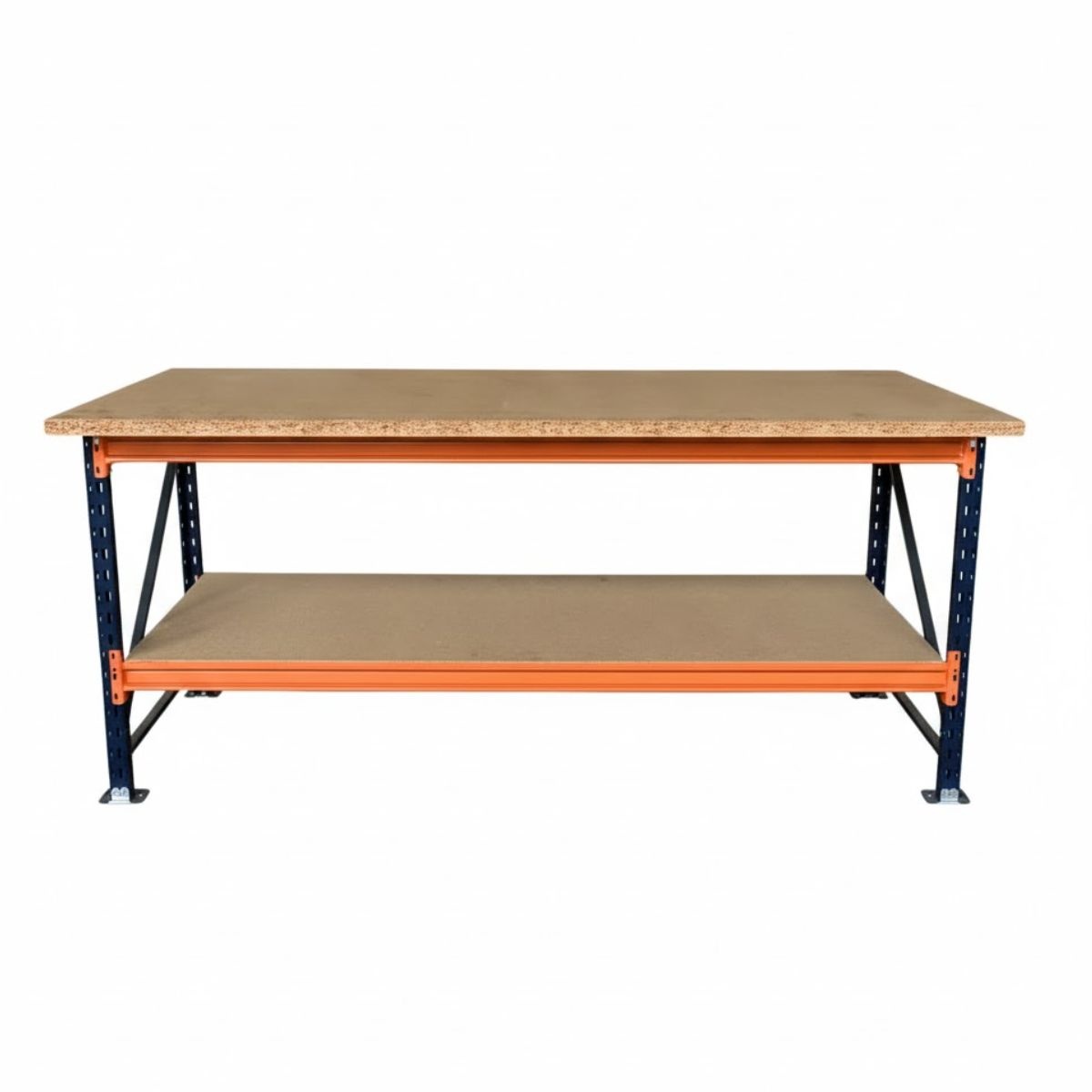 Het werkblad is gemaakt van 38 mm dik C-dur hout, dat bestand is tegen spatwater en niet kromtrekt. De stalen poten zijn opgebouwd uit dezelfde sterke stellingmaterialen die ook in industriële magazijnstellingen worden gebruikt. Hierdoor kan de tafel een hoge belasting aan en blijft hij jarenlang stabiel in gebruik.