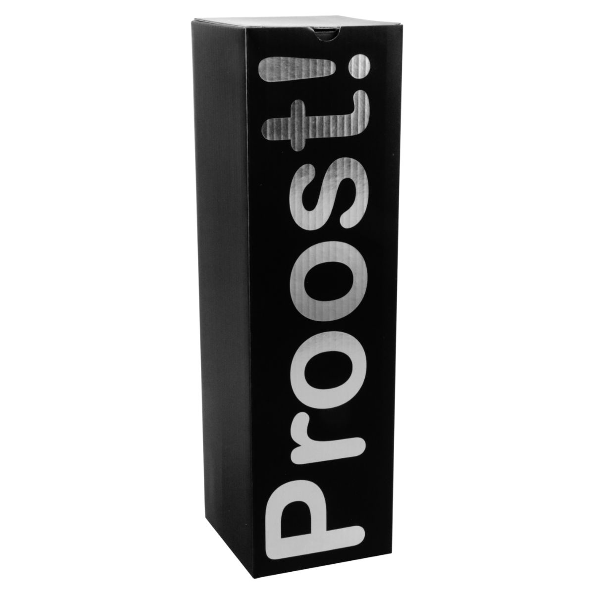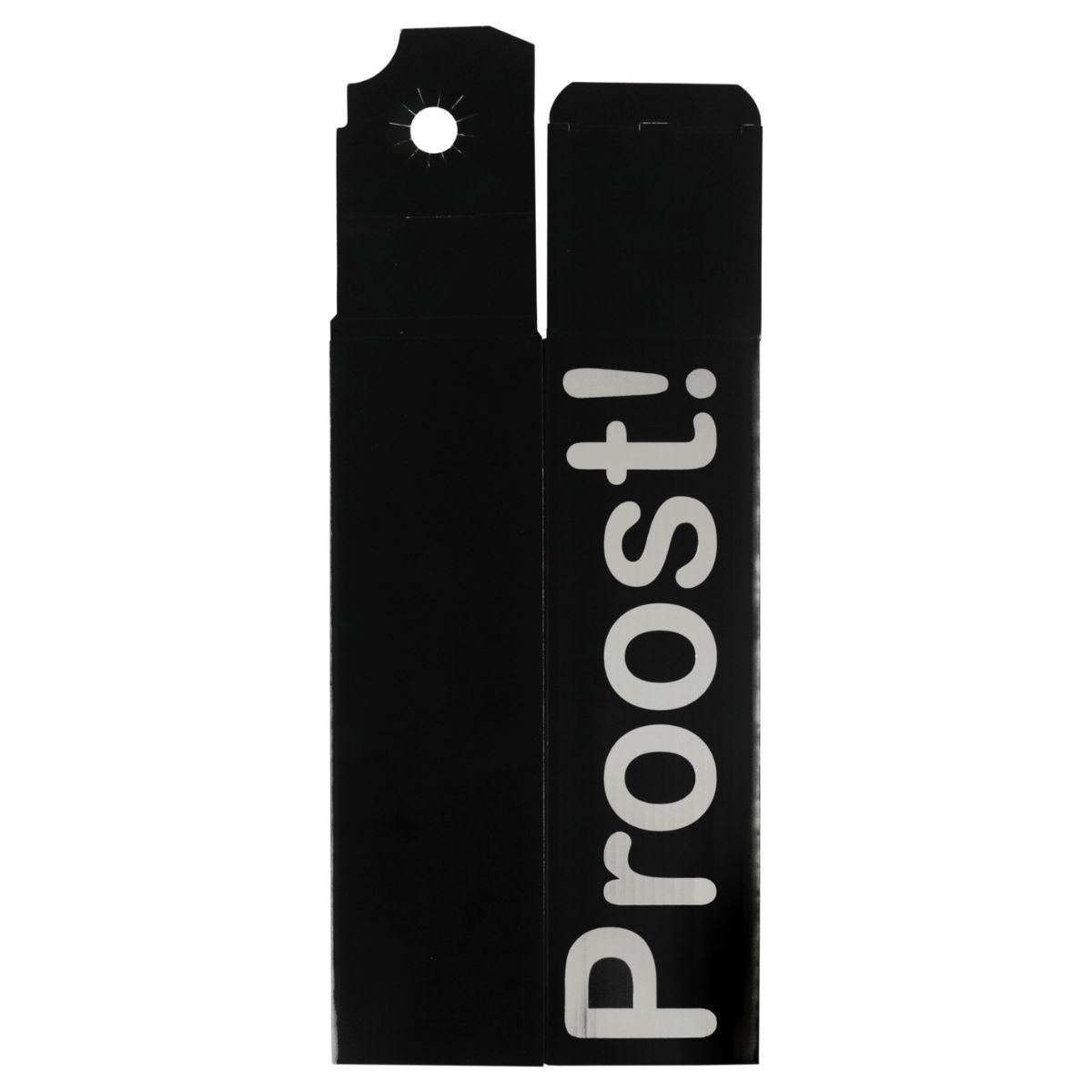 Wil je een fles wijn, champagne of speciaalbier op een stijlvolle manier cadeau doen? Deze luxe zwarte flesdoos met de tekst 'Proost' is de perfecte verpakking om direct een feestelijke indruk achter te laten bij je relaties of vrienden.
