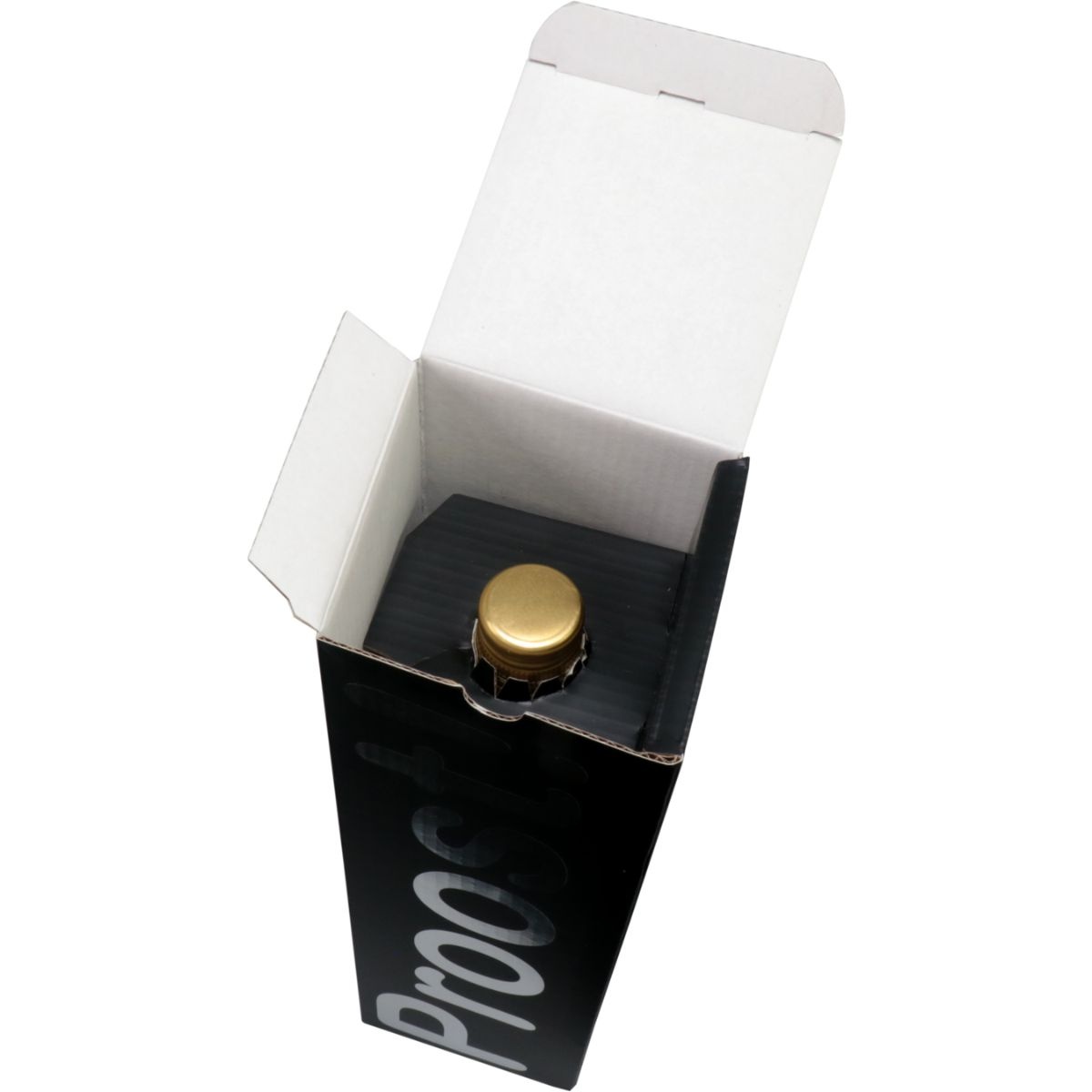 Dankzij de elegante bedrukking met de tekst 'Proost' hoef je de doos niet meer apart in te pakken met cadeaupapier; de verpakking is op zichzelf al een cadeau. De doos is specifiek ontworpen om één standaardfles stevig op zijn plek te houden, wat breuk voorkomt en de presentatie professionaliseert.
