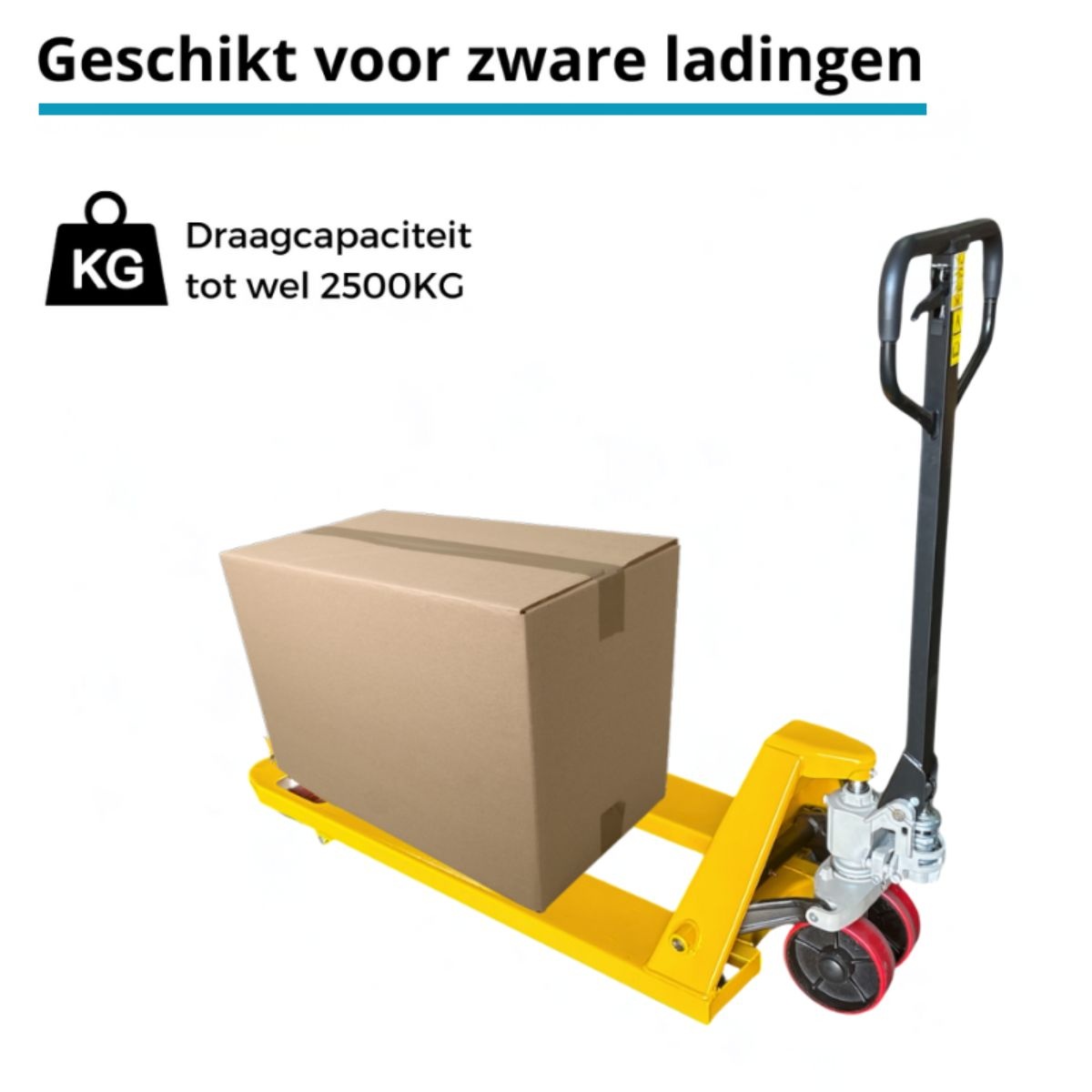 Met een draagvermogen van 2500 kg verplaats je moeiteloos pallets met zware producten. De vorklengte van 1150 mm is geschikt voor standaard europallets. De dubbele vorkwielen zorgen voor extra stabiliteit bij het rijden over drempels of oneffen vloeren.
