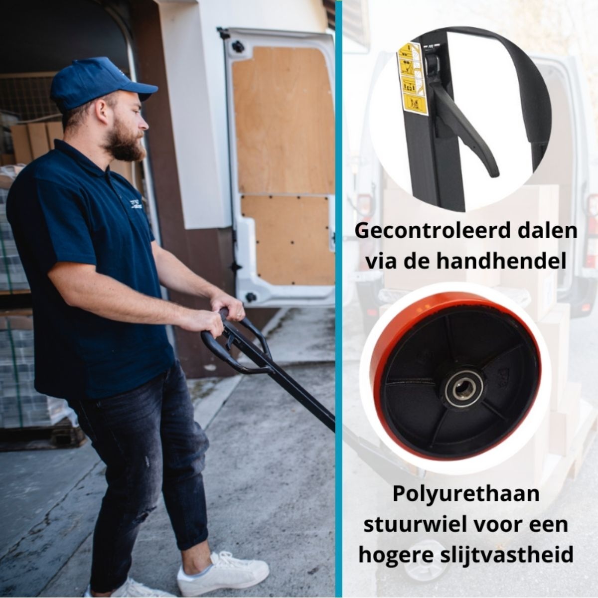 De stuurwielen zijn gemaakt van rubber voor optimale grip en soepele besturing. De dubbele vorkwielen van polyurethaan lopen licht en stil, ook bij hoge belasting. Bediening is eenvoudig: heffen, rijden en dalen doe je met één handbeweging.