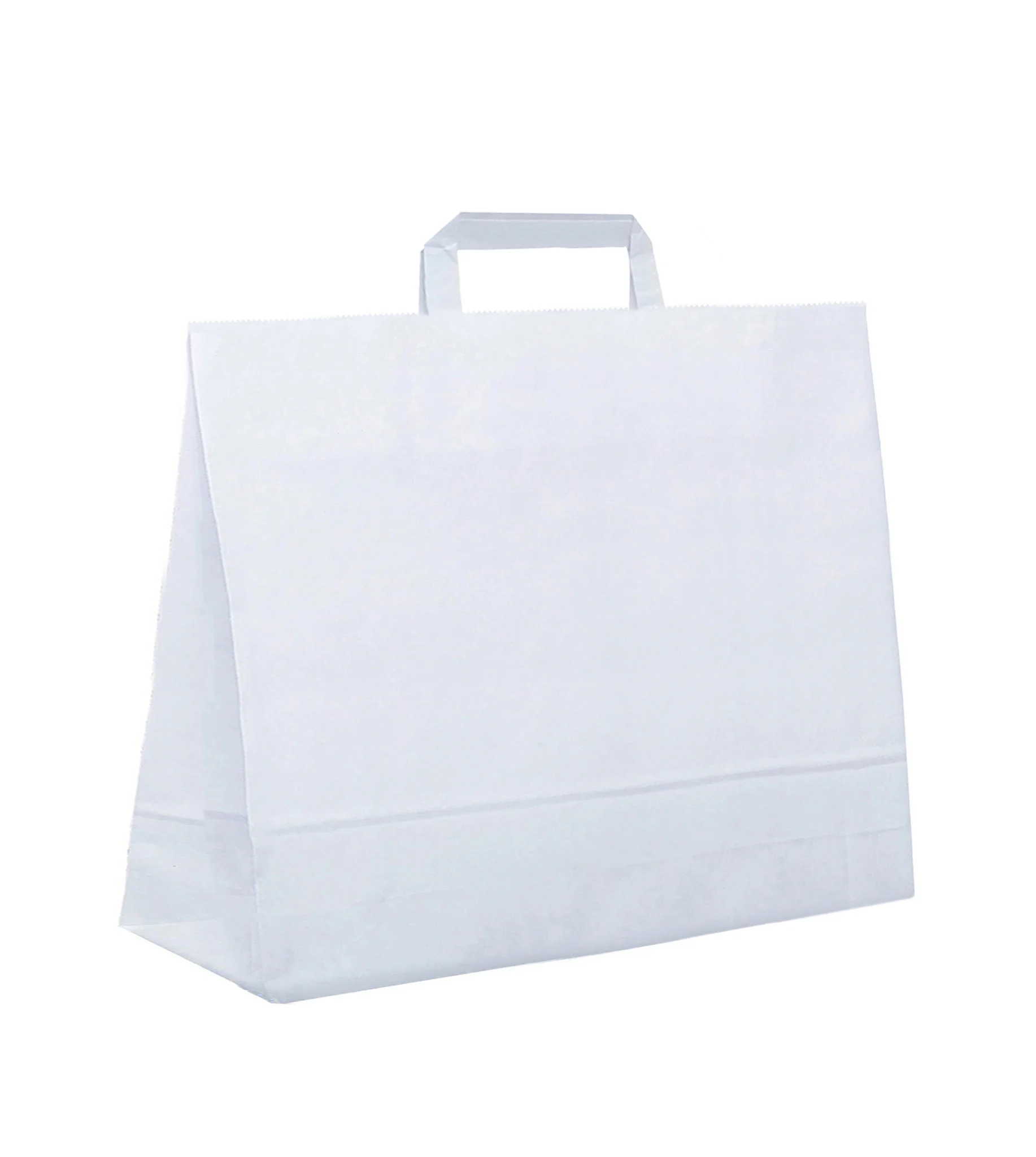 Papieren draagtas met stevige handgrepen van een papieren koord of met platte handgreep. Deze vlotte witte meeneemtas van sterk kraftpapier is ideaal voor het meegeven van allerlei artikelen. Zowel in de food- als non-foodsector. Denk hierbij aan: etenswaren, kleding, tijdschriften, en geschenken. De
