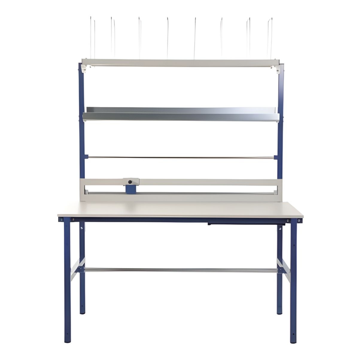 De tafel wordt geleverd met een afrolas van 1375 mm breed, een metalen accessoireplank en een bovenplank met 8 verstelbare tussenschotjes. Dankzij het geïntegreerde snijmes kun je verpakkingsmateriaal netjes en veilig op maat snijden. Ideaal bij het verwerken van papierrollen, folie of opvulmateriaal.