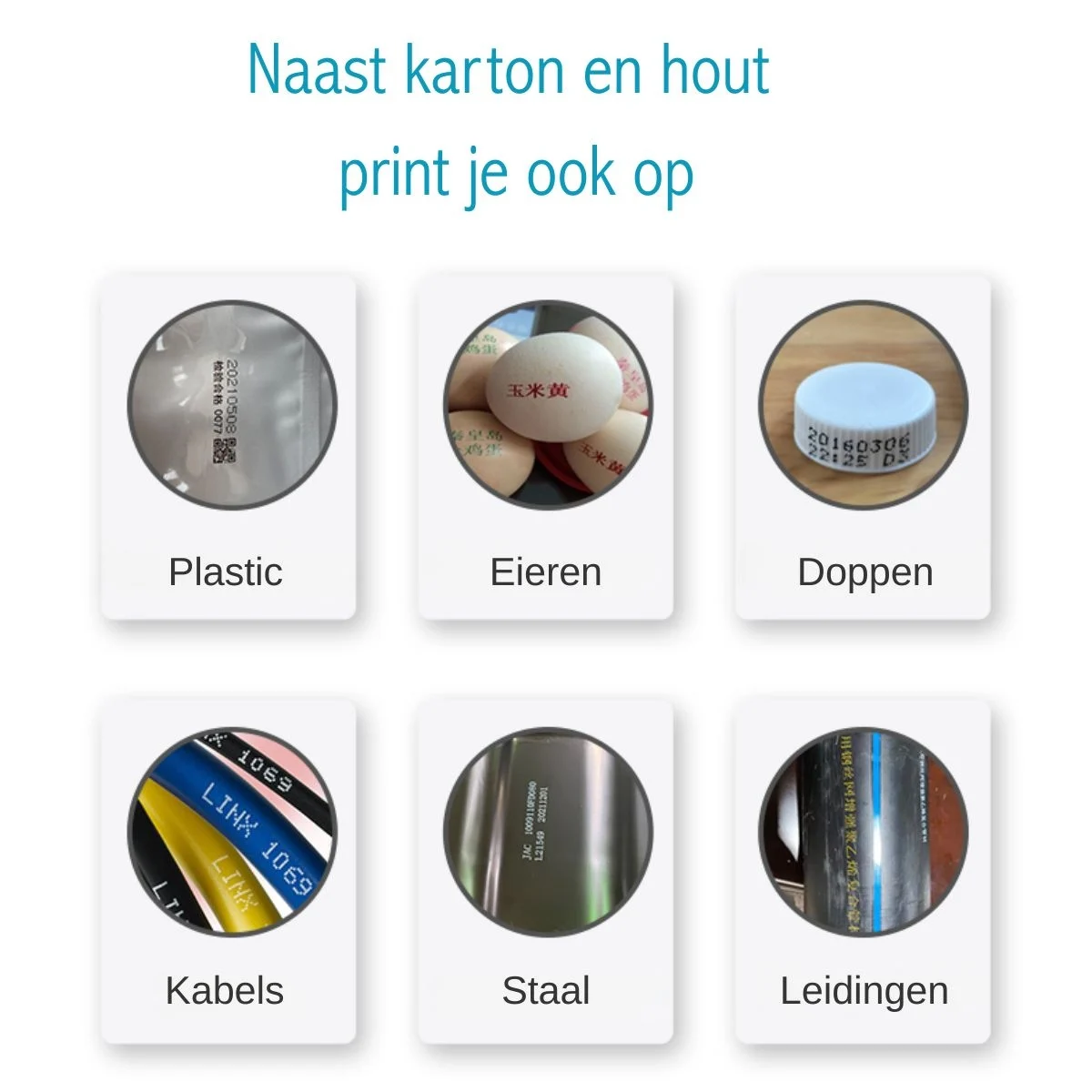 - Geschikte materialen: Karton, papier, hout, kunststof, metaal en glas