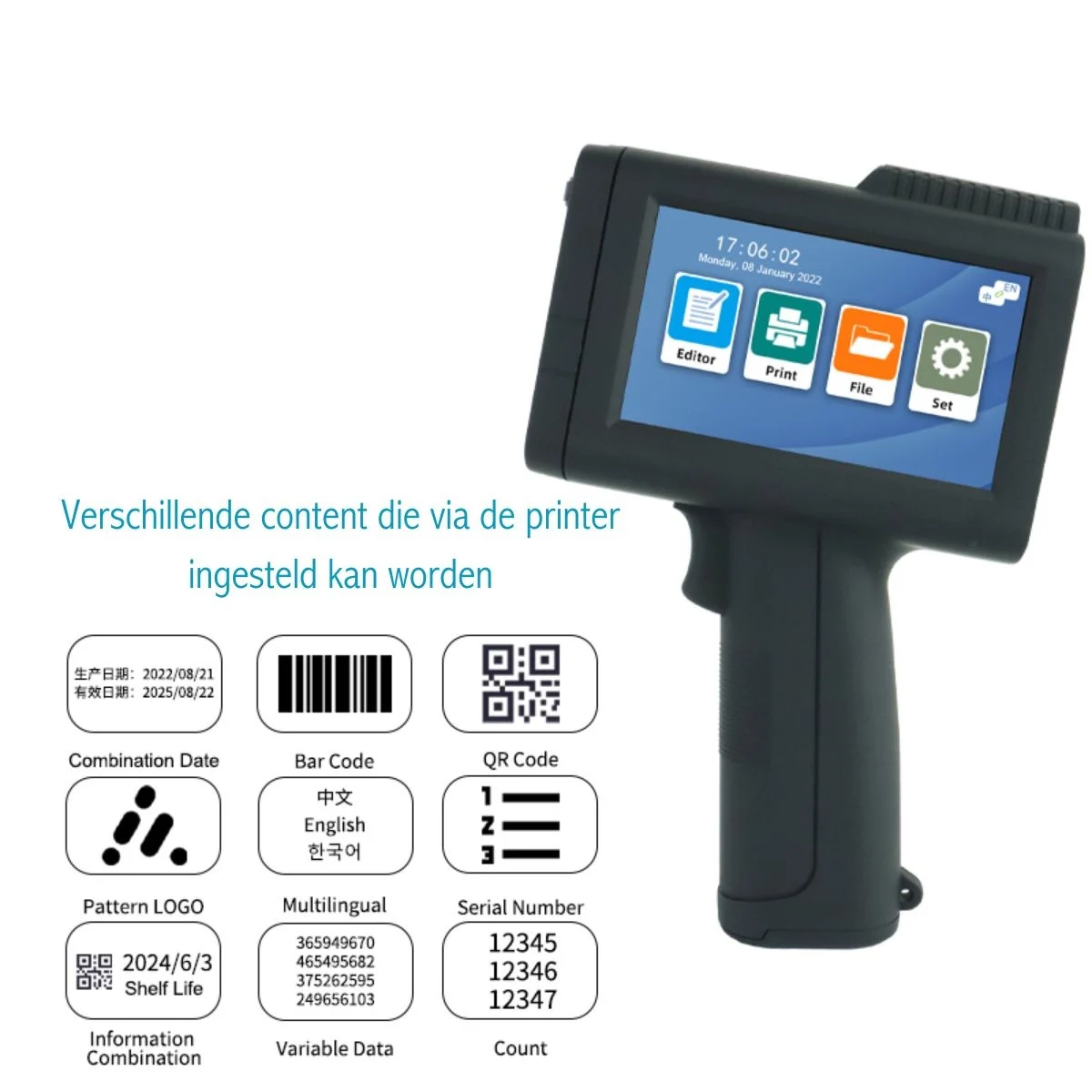 - Functies: Tekst, datum, tijd, barcodes, QR-codes en logo-import via USB