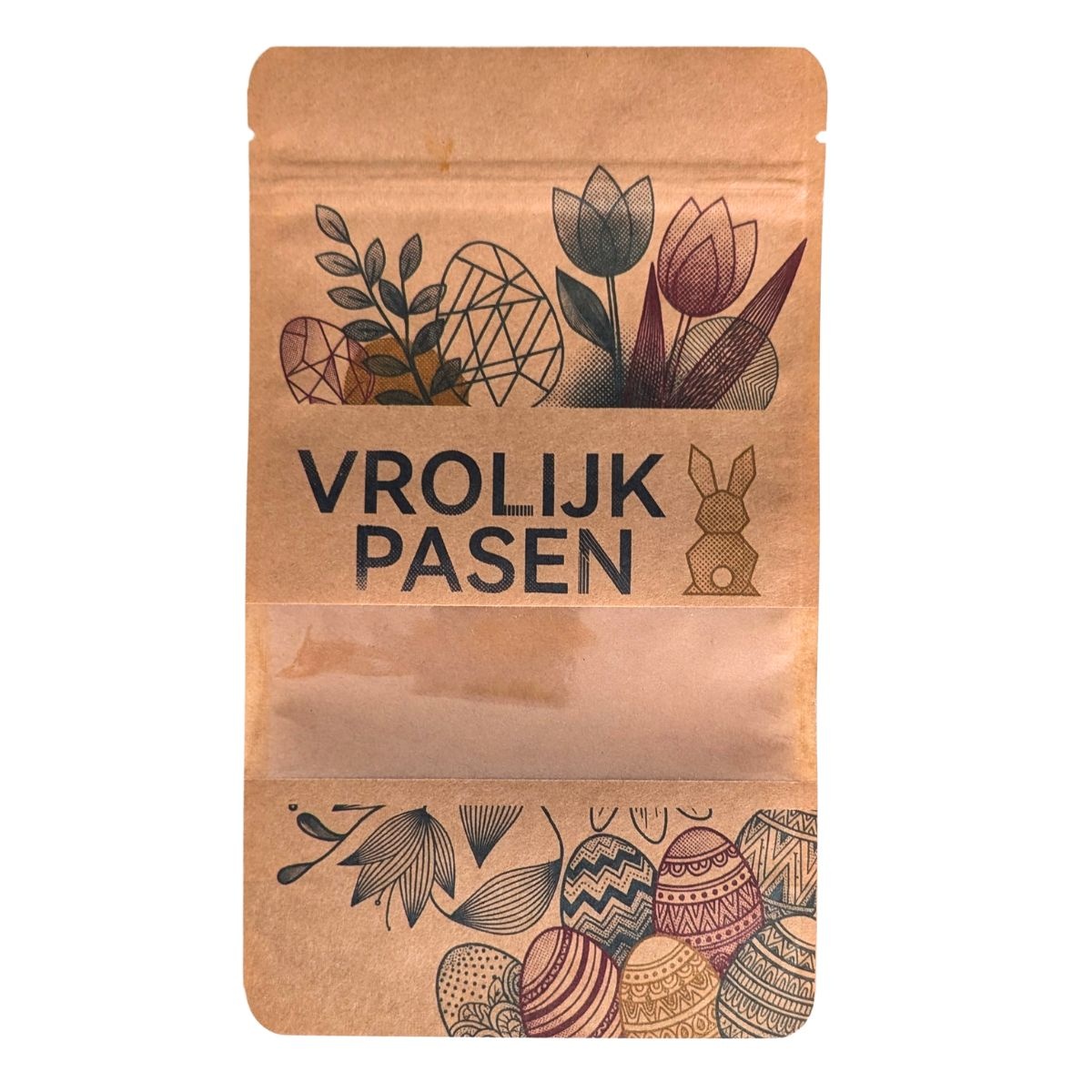 Deze stazakken combineren een duurzame uitstraling met maximale presentatiewaarde. Dankzij de stevige bodemvouw blijft de zak stabiel rechtop staan, wat perfect is voor presentatie in een pakket of op een bureau. Het geïntegreerde venster biedt een directe blik op de inhoud, waardoor de kleurrijke paaseitjes extra verleidelijk overkomen. De binnenzijde is afgewerkt voor optimale bescherming van de versheid.